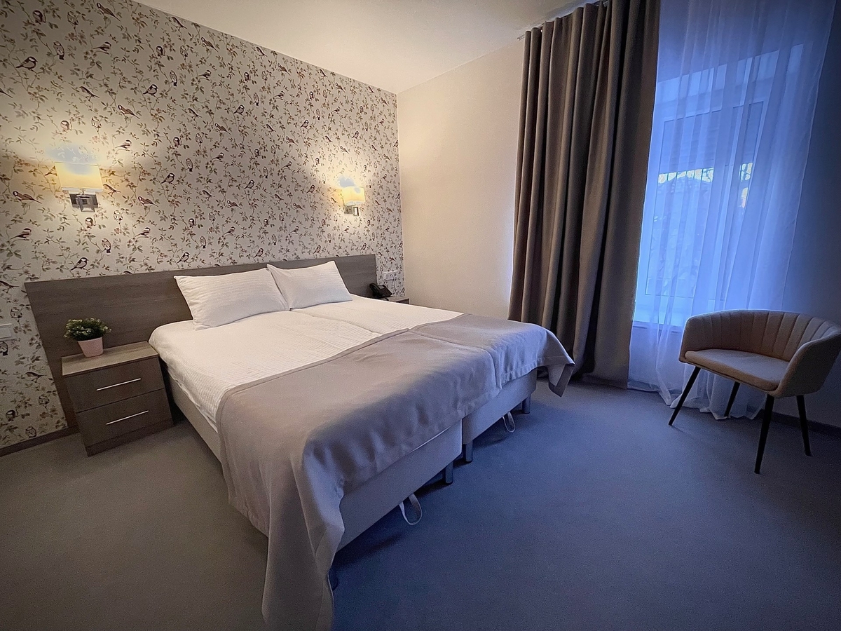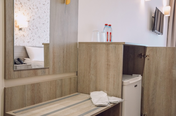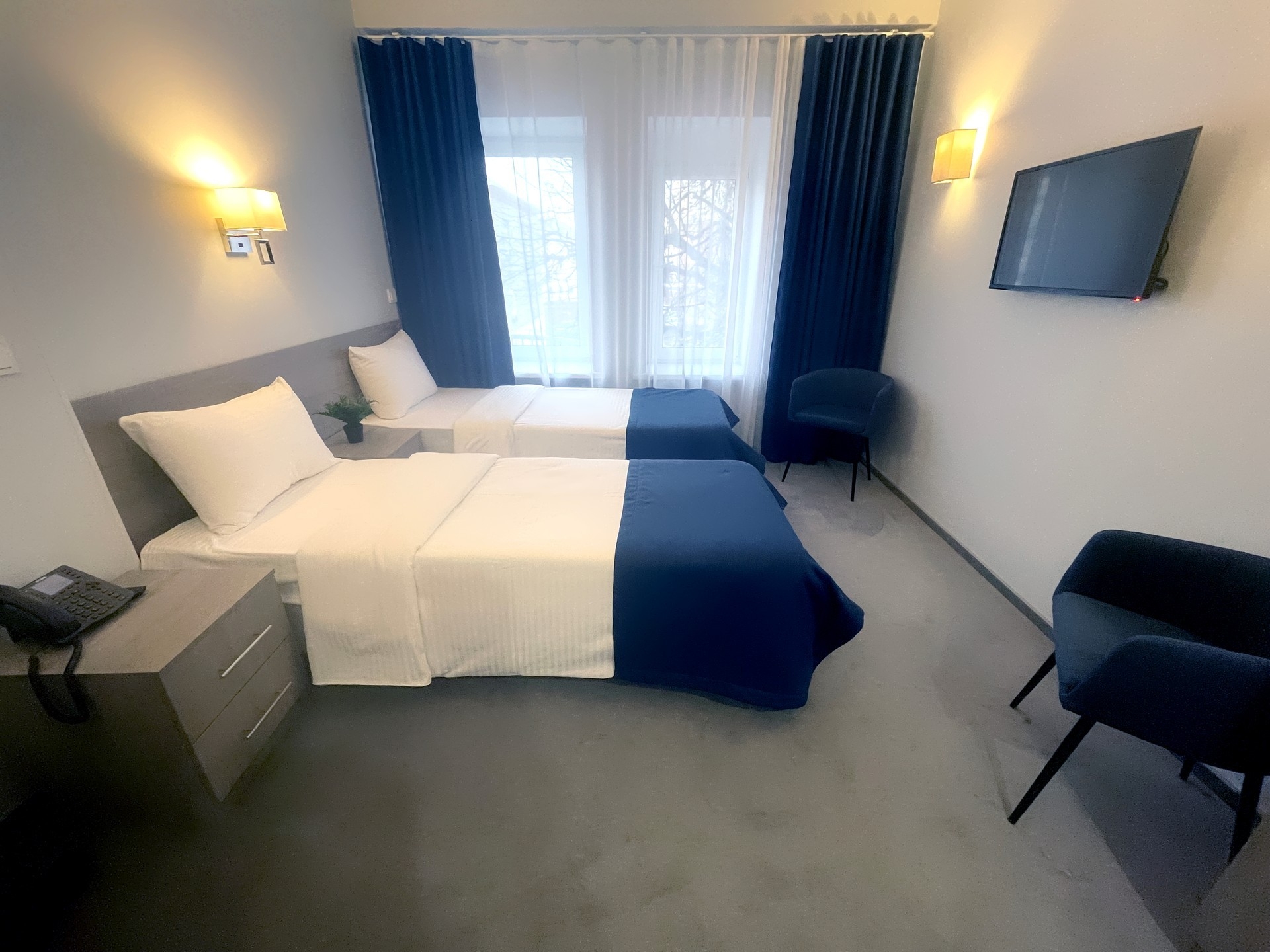 • Размер номера 18 кв.м • WI-FI/ односпальная кровать 160 см или две раздельные кровати 80 см • Холодильник/ просторный гардероб • Туалетные принадлежности/ душ • Полотенца/халат/тапочки • Вода/Фен • Электронный замок